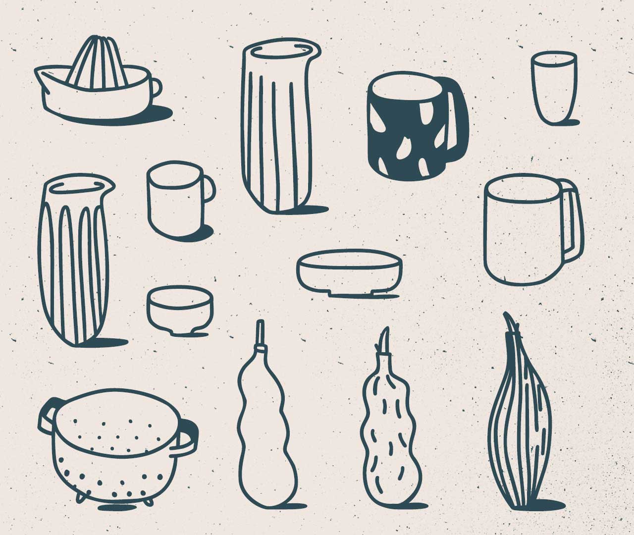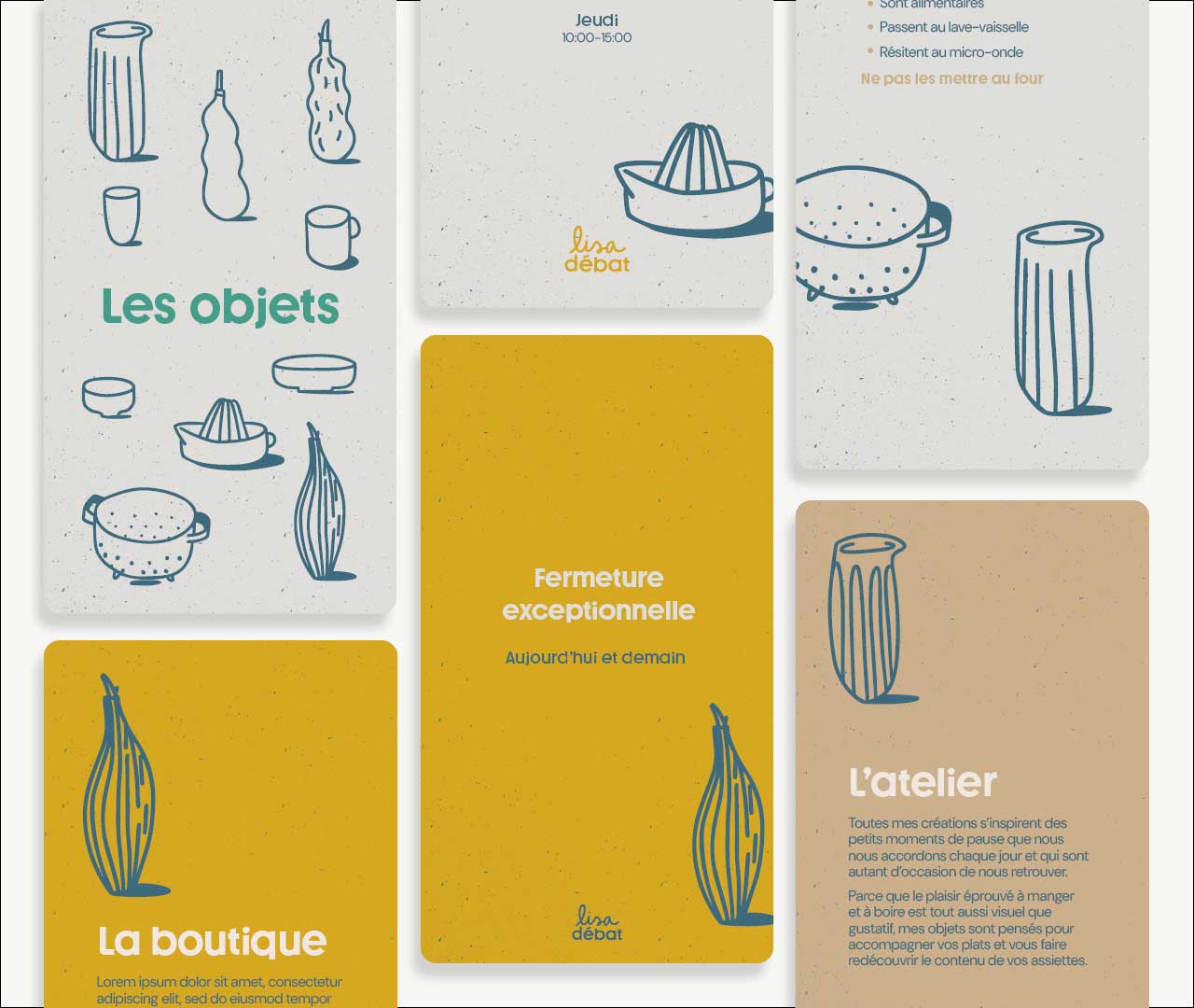 Lisa Débat est céramiste à Strasbourg. Nous avons élaboré ensemble son logo en se basant sur la signature manuscrite que Lisa grave au dos de ses céramiques. Ses croquis de travail ont servi de base pour les illustration. J'ai également créé une texture de fond rappelant l'argile pyritée qu'elle utilise, et qui donne une style caractéristique à ses créations. Pour la partie imprimée, nous utilisons un papier créé à base de déchet de l'industrie alimentaire dont la couleur reproduit naturellement l'effet moucheté du l'argile pyritée. Cela permet de ne pas imprimer de couleur de fond et donc de limiter la quantité d'encre utilisée tout en améliorant la recyclabilité du papier.
