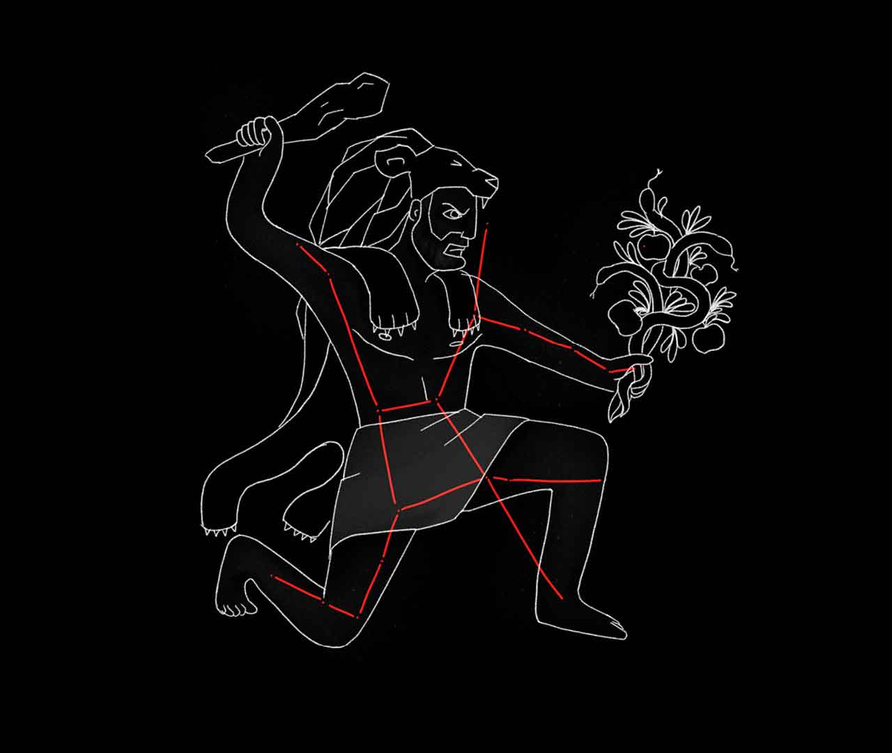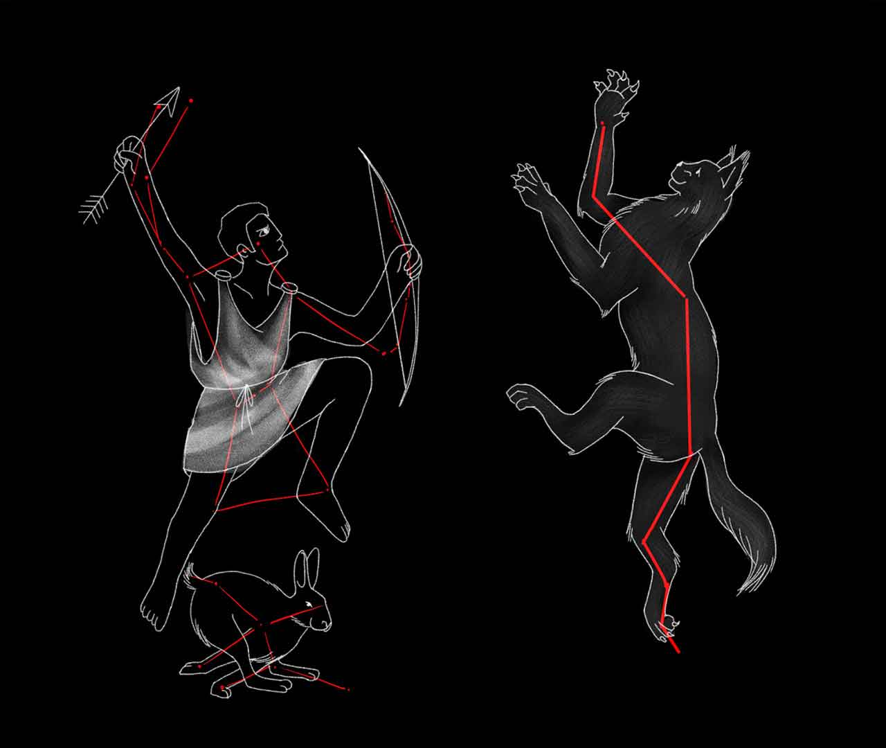 Jusqu'à présent, les illustrations à disposition des médiateurs du planétarium Strasbourg sont celle de l'Atlas Coelestis, dessinées par John Flamsteed et publiées en 1729. Reflets de leur époque, ces constellations véhiculent un imaginaire dans lequel la nature et le monde animal sont des univers effrayant que l'on doit dompter. Le bestiaire qui y est représenté est souvent monstrueux, et en décalage avec la réalité des animaux qu'il représente. Ces représentations à travers lesquels le public peine à se projeter sont aujourd'hui un frein pour les médiateurs, qui évitent de montrer certaines constellations trop longtemps car elles font peur aux enfants. Nous avons donc entrepris un travail de refonte des 88 illustrations du ciel nocturne. Elles sont un support central pour les médiateur·ices, et sont donc crées en étroites collaboration avec elleux pour proposer une forme qui à la fois aide la mémorisation et favorise la projection des spectateur·ices dans les mythes associés.
