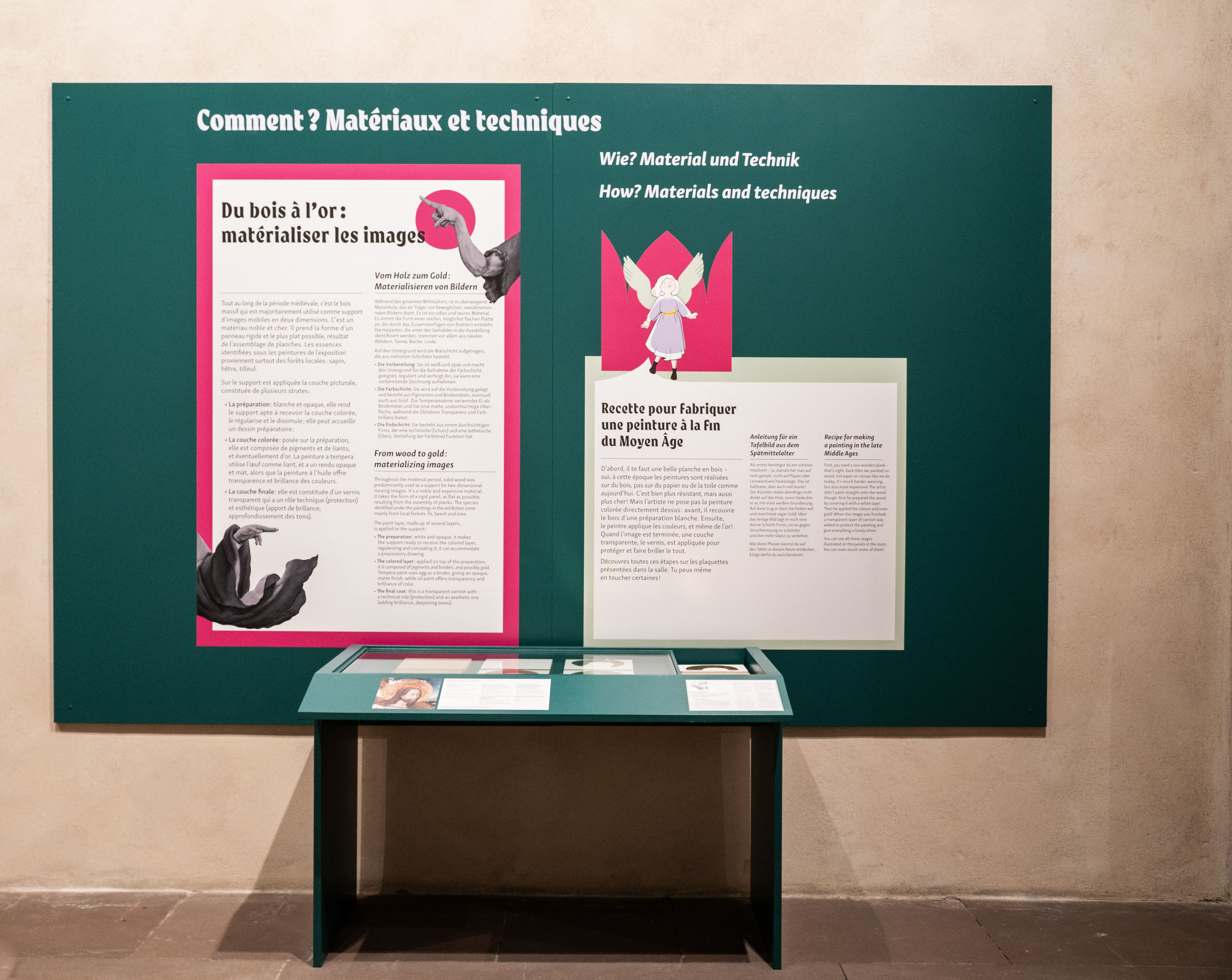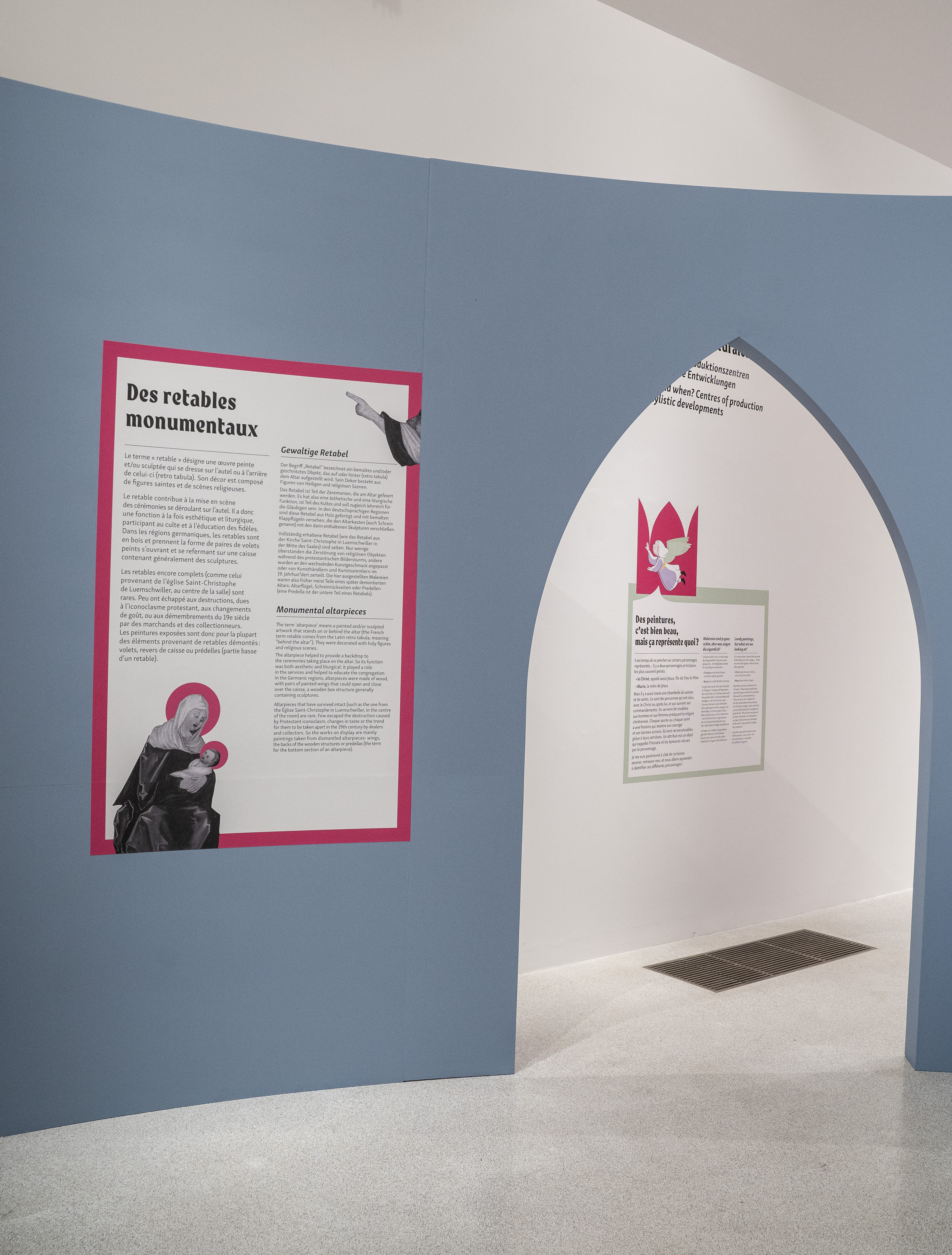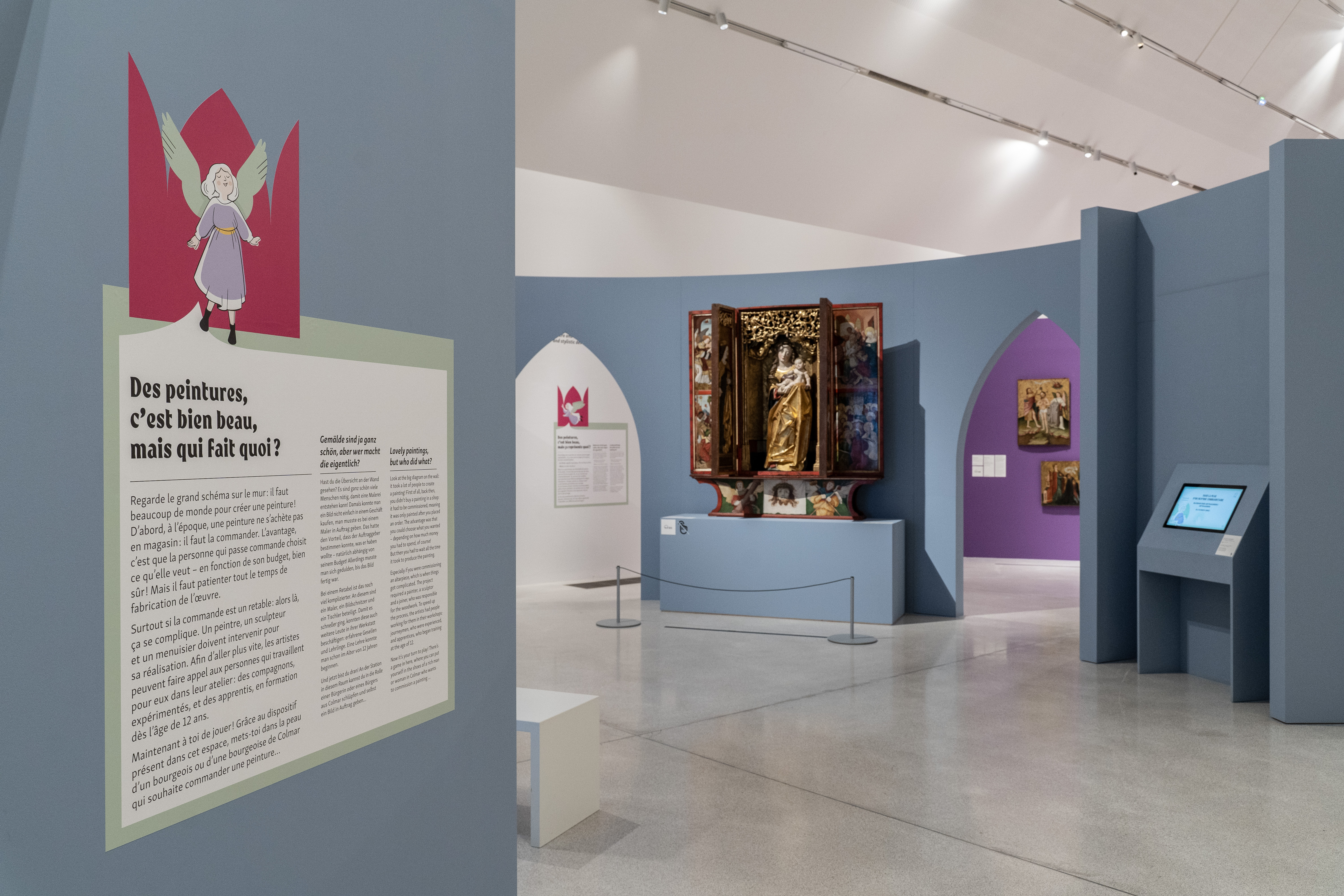 Direction artistique et création de l'identité visuelle de l'exposition Couleur, Gloire et Beauté pour le Musée Unterlinden. Le but de cette exposition était de rendre le sujet accessible à tous à travers deux parcours didactiques parallèles, proposant deux niveaux de lecture tout en gardant une unité graphique.